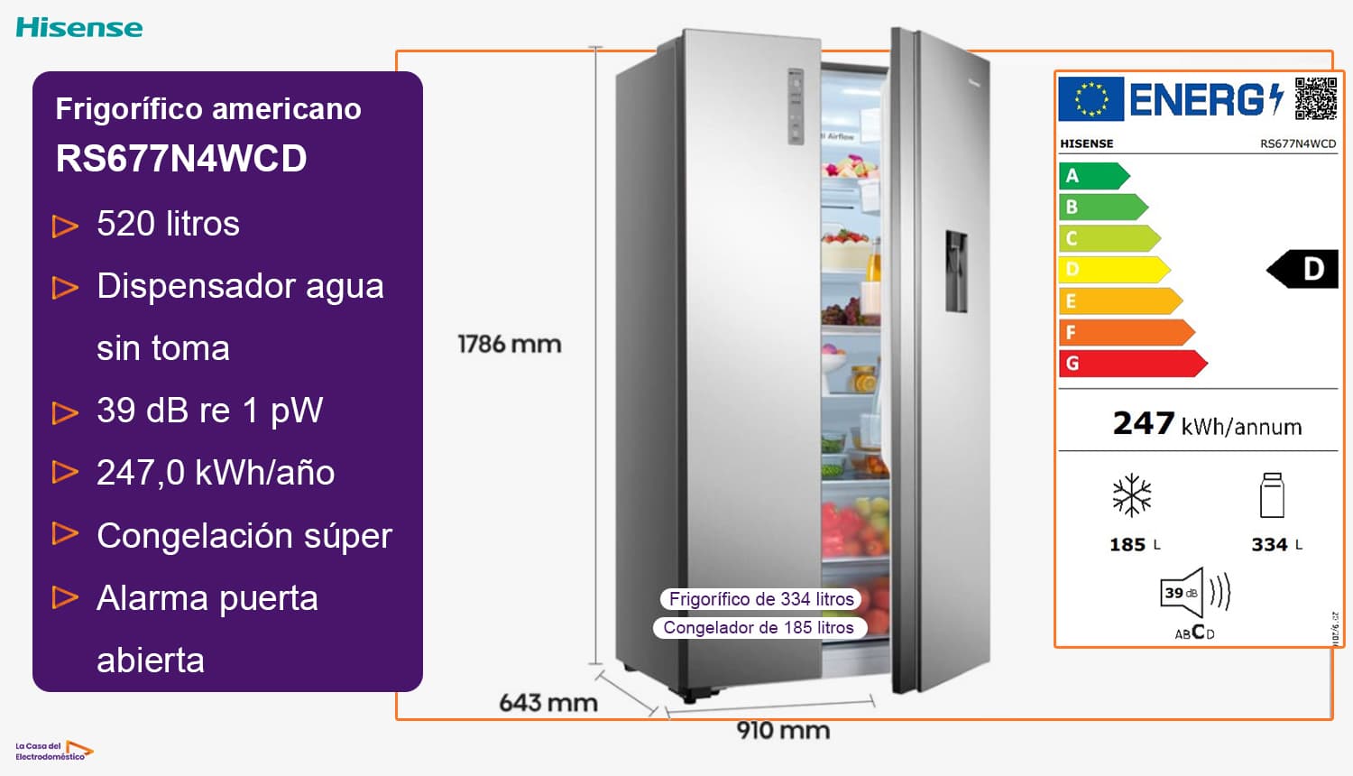 Hisense RS677N4WCD - Frigorífico americano inox Dispensador com depósito.
