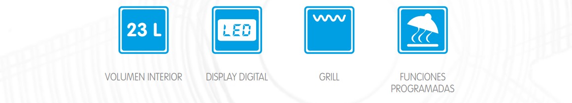 | Selector de potencia de grill con 2 niveles √ Funciones microondas, grill, grill + micro y programadas | |