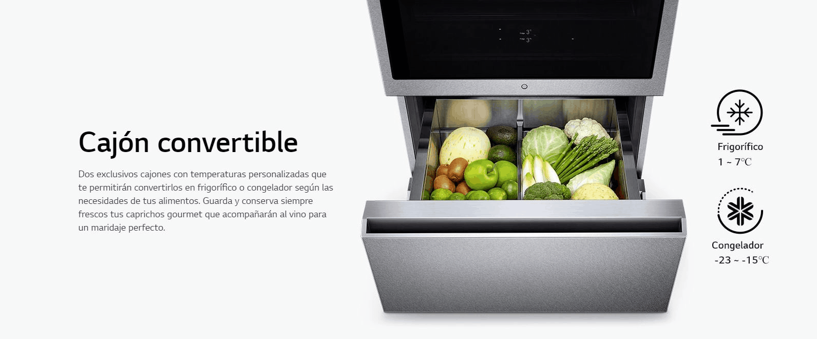 | Ideal para a conservação e envelhecimento do vinho, mantenha seus caprichos gourmet sempre frescos, graças às gavetas conversíveis, para uma combinação perfeita. | |